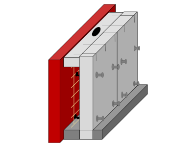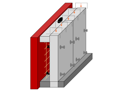 • Scier l'isolant au droit des sciages du négatif en vue d'insérer les épingles de laison du parement extérieur en inox.